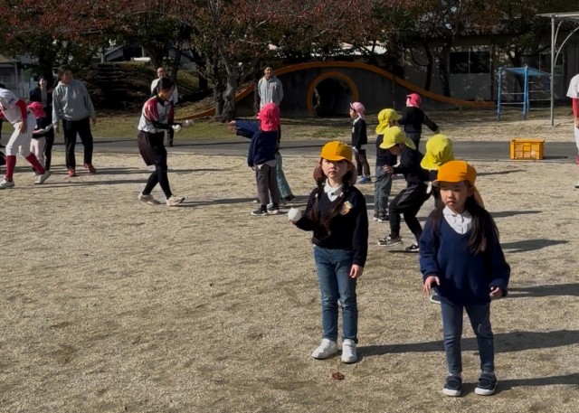 11月14日(金)に,ロザリオ幼稚園と聖カタリナ大学短期大学部附属幼稚園の年長児童(56名)たちと,聖カタリナ大学短期大学部附属幼稚園運動場にて,キャッチボール・ボール投げやバッティングを行いました。工夫を凝らした内容で,体力づくりもできたようです。